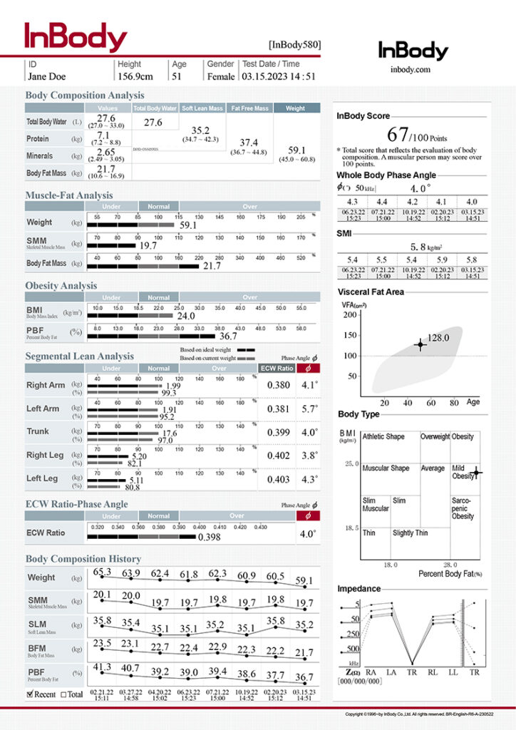 The InBody 580 performs segmental analysis, assessing each limb and your trunk to reveal its muscle mass, body fat, body water balance, and cellular health. This gives you insight into: